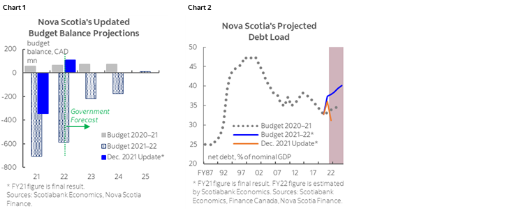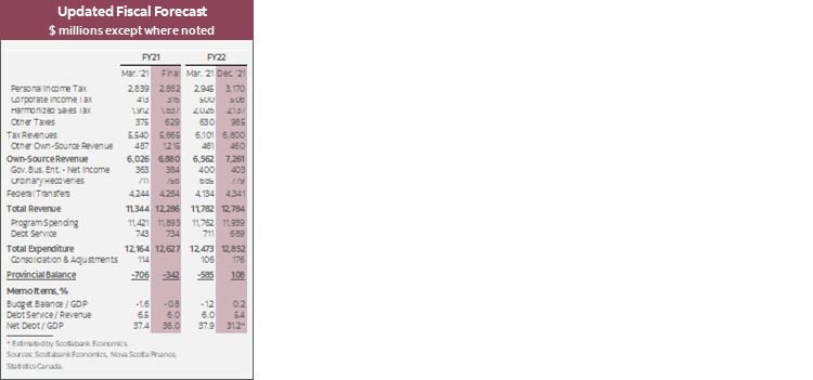 In its latest Update, Nova Scotia pencilled in a balanced budget in FY22, attributable to prudent fiscal planning and stronger revenue prospects than budgeted from virtually all sources. This puts the province ahead of schedule on its path to balance proposed in the last fiscal blueprint, which aimed at eliminating the deficit by FY25. The province’s own-source revenue was lifted by 11% from the projections made in 2021 Budget. The $346 mn prior-year tax revenue adjustment, which came from higher PIT, CIT and HST in the 2020 taxation year, accounted for half of the tax revenue boost. Without this, FY22 would have still been in the red, albeit a much narrower shortfall than projected. An increase in federal transfers also contributed to the large improvement this fiscal year, with the province benefiting from higher population estimates.