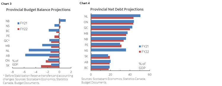 The province started off the fiscal year in good shape, with projected FY21 and FY22 deficits among the lowest of the provinces (chart 3), as well as middle-of-the-pack net debt levels (chart 4). The latest release did not provide an update on the net debt level, but the $693.2 mn and $364 mn respective fiscal improvements in FY22 and FY21 imply a significant reduction in net debt level. Reducing the deficit component of Budget 2021 net debt forecasts according to updated balance projections results in a net debt burden of about 31% of GDP in FY22. This is close to the net debt level projected in the pre-pandemic budget for FY22, and a sharp decline from the 36% of GDP posted in FY21. Likewise, the cash requirements will be much more modest than the $1,761 mn forecasted for FY22 at Budget time.