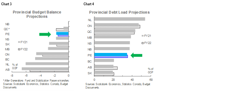Relative to other jurisdictions, however, the Island’s finances are in good shape. Deficits of about 1.5% of provincial GDP in FY21–22 are among the lowest forecast by any subnational government in Canada thus far (chart 3, p.2). Ditto for net debt, despite the increase as a share of output expected in FY22 (chart 4, p.2). These figures reflect a strong fiscal position entering the pandemic, early and decisive action that helped quell the spread of COVID-19, and the natural advantages of Island status. PEI’s modest economic contraction relative to other jurisdictions in 2020 is well-established, and Budget noted a number of economic indicators for which PEI’s results far outperformed the national average in 2020.