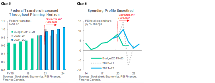 A planned increase in federal funding unlocks greater spending potential for the Island. The fiscal plan released in June 2020 assumed that transfers from Ottawa would surge by more than 20% in FY21, then retreat at a roughly equal rate the next year as pandemic support waned. By contrast, this year’s plan is built on average annual transfer growth of 3.5% during FY22–24, which puts FY22–23 revenues from federal sources on track to exceed the prior plan’s levels by more than $250 mn (chart 5, p.3). With the benefit of those funds, the province has pencilled a 4.4% climb in total expenditures into FY22—presumably reflecting the cost of new programs and policies—which compares to a 7.8% cut planned as of the June 2020 fiscal blueprint (chart 6, p.3).