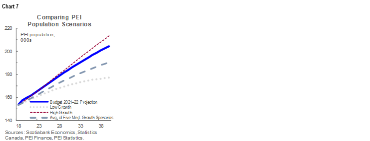 Population growth remains a key question mark with mobility limited and travel restrictions still in place. PEI witnessed the strongest headcount gains of any province in Canada during the years leading up to the pandemic, and those gains were anchored by the attraction and retention of skilled newcomers. Population projections underlying the fiscal plan—discussed in the budget paper and released in the prior week—are feasible, but acknowledged to be tilted towards the optimistic end of the range of standard Statistics Canada scenarios (chart 7, p.3). The Province assumes that immigration levels will return to their long-run trend by the end of 2021.