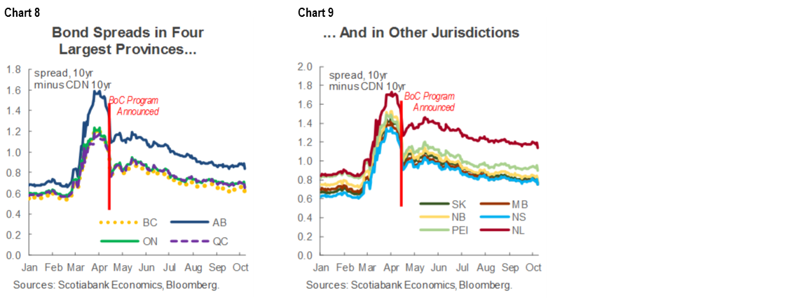 Bank of Canada purchases have played a role in restoring function initially, but relative attractiveness of offerings has also been a driving factor in market liquidity. The central bank has purchased around $10 bn in provincial bonds—of the $107 bn in total provincial bond issuance as of end-September—which is well-shy of the Bank’s $50 bn cap for its Provincial Bond Purchasing Program as market liquidity has been resilient.