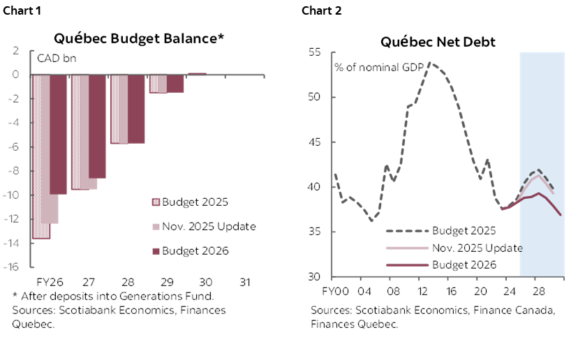 - Bottom line: Ahead of a change in Premier next month and a provincial election due by the Fall, Québec has released improved near-term deficit projections and a lower debt path, driven by stronger recent economic growth and limited new spending. As signalled in advance, this was largely a status-quo budget with few new measures—though some new funding for core services and infrastructure. The new Premier will want to put their mark on the government ahead of the election, and they will surely welcome this stronger fiscal handoff.