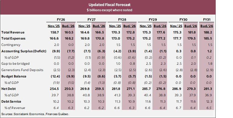 Québec’s budget update presents smaller near-term deficits but an unchanged timeline to return to balance. The final estimate for 2025–26 (FY26) is a headline deficit of $9.9 bn (1.5% of nominal GDP), down from the estimate of $12.5 bn in the mid-year fiscal update. The overperformance has been driven by stronger tax revenue and limiting new spending to within the budgeted $2 bn contingency envelope. Moderate revenue growth averaging 3.2% is projected for the next few years, with expense growth set to be half that at 1.6%, leading the deficit to steadily trend lower until the budget is balanced in FY30—the deadline set by provincial legislation. The fiscal framework continues to have a contingency reserve of $2 bn in the near-term and $1.5 bn in later years to provide some protection against new spending pressures or downside economic risks, though the later years of the deficit projection continue to include sizeable (albeit smaller than previously) annual savings to be identified later.