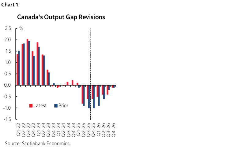 In Canada, the most important new piece of information since the last forecast round has been the historical revisions. While these do not change the projected growth path over the forecast horizon, they leave the economy starting from a stronger position. We assess that the revision to the level of GDP mostly reflects higher potential output, as a large part of the change came from higher business investment. Still, these revisions imply less excess capacity, adding to the evidence that the economy is in a better cyclical position than we previously thought (chart 1). This is fully consistent with our view that the Bank of Canada is done with rate cuts and that the next move will be a hike.