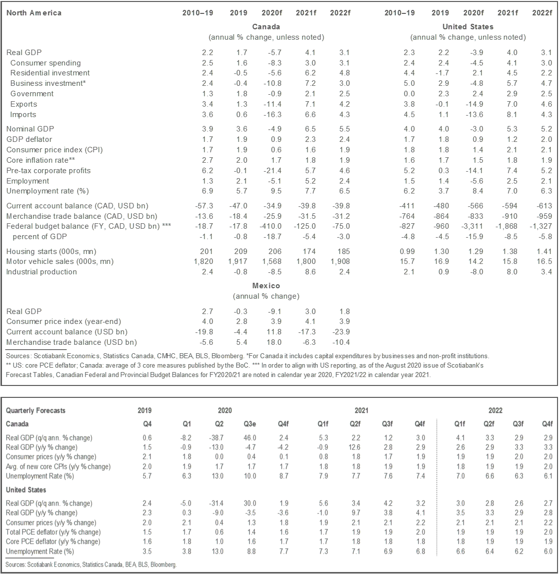 Our outlook does not incorporate the potential impact of the US election. It appears, at this point, that Mr. Biden will defeat President Trump. A President Biden, however, would be unable to alter the course of fiscal policy if Republicans maintain control of the Senate. In fact, it could well be that Senate Republicans block attempts by the new administration to support the economy as it continues to process the impacts of the pandemic. As Chairman Powell has noted many times, there remains a clear need for extensive fiscal support in the US economy. The current politicking around the extension of employment benefits is a taste what may come if Mr. Biden wins and the Republicans keep the Senate. If so, that would be negative for the outlook. Conversely, a Democratic Senate would likely be much more supportive of enhanced fiscal support, which could lead us to raise our forecast for next year. Finally, while President Trump seems unlikely to win at the moment, a victory is not out of reach. A second Trump mandate would likely see more fiscal support given the President’s newfound appreciation for stimulus. One thing is certain: the electoral distraction will be over soon, and a return to governing and a focus on the needs of the economy will be a welcome relief from the past few weeks.
