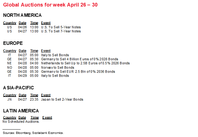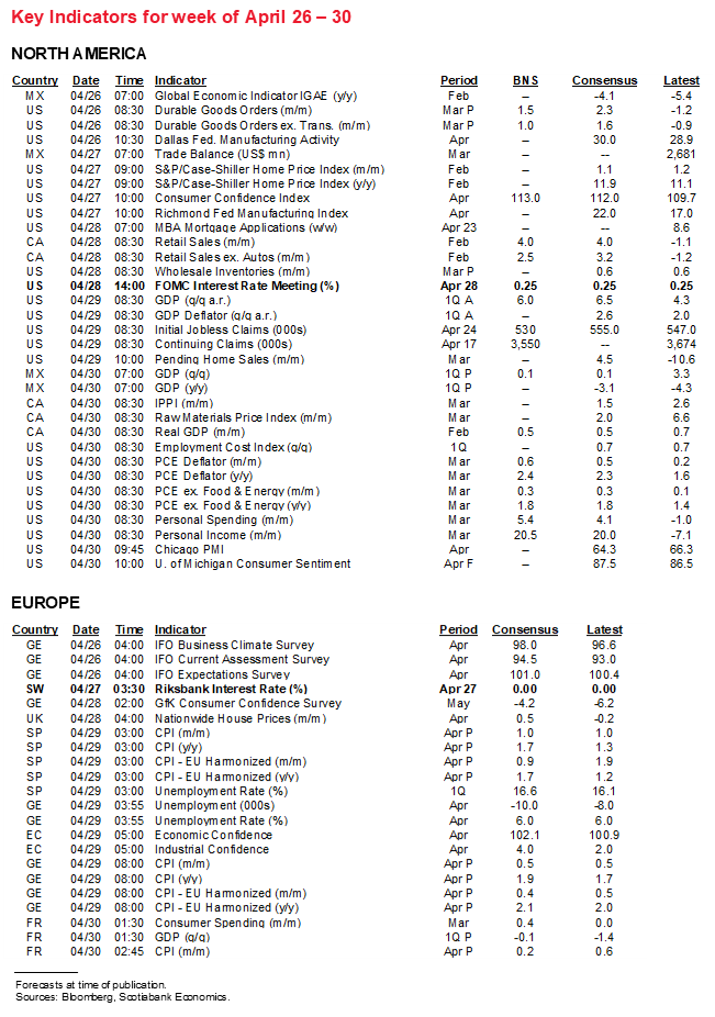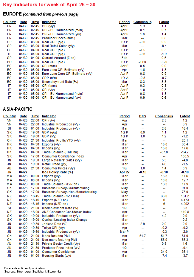 The US is also expected to register a decent gain in durable goods orders during March (Monday), a further rise in the Conference Board’s consumer confidence measure during April (Tuesday), and a possible rebound in pending sales of existing homes during March after harsh weather dampened February’s sales (Thursday). The Richmond Fed’s manufacturing gauge for April (Tuesday) will further inform ISM-manufacturing expectations on May 3rd; each of the Philly Fed, Empire and Kansas City measures registered improvement which tentatively points toward a further rise in the ISM gauge.