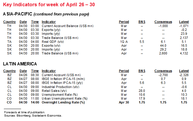 This report has been prepared by Scotiabank Economics as a resource for the clients of Scotiabank. Opinions, estimates and projections contained herein are our own as of the date hereof and are subject to change without notice. The information and opinions contained herein have been compiled or arrived at from sources believed reliable but no representation or warranty, express or implied, is made as to their accuracy or completeness. Neither Scotiabank nor any of its officers, directors, partners, employees or affiliates accepts any liability whatsoever for any direct or consequential loss arising from any use of this report or its contents.