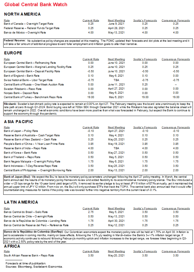 Sweden’s Riksbank is not expected to alter policy on Tuesday. A lot has transpired since its last meeting way back on February 10th, but not all of it has been good. Sweden’s COVID-19 case count has risen 56% since that time. Cases and restrictions have risen across some of its export markets. GDP growth has been mixed as Q4 registered an unexpected contraction but the prior quarter was upgraded. Underlying inflation has accelerated to 1.9% y/y but partly on the back of the deceleration that was in play since the end of 2019. Overall, watch for limited upgrades to growth forecasts but the central bank’s guidance for its policy repo rate is likely to remain at 0% throughout the 2021–24 forecast horizon.