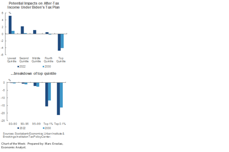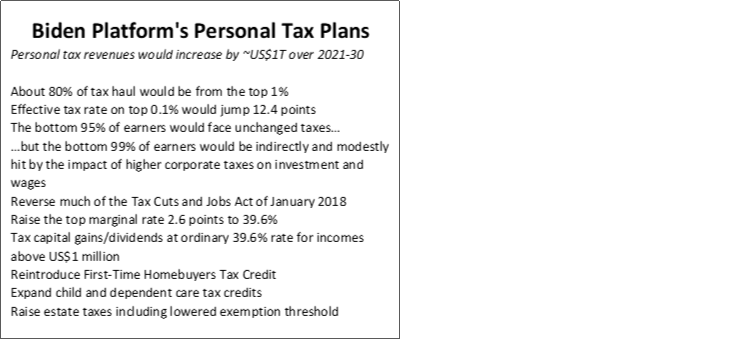 As another reminder, the Biden Administration’s pledge not to raise taxes on the middle class does not mean that they would skirt by the consequences to plans to tax the stock market through sharp increases in capital gains taxation. The cover chart on the front of this publication shows how changes to personal income taxes would directly affect upper income Americans. That doesn’t mean that changes in tax policy writ large won’t affect the middle-income earners.