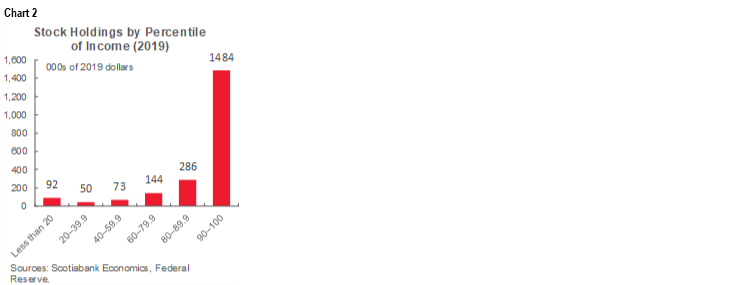 Enter chart 2 that shows that families in the 60th–80th income percentile range with before-tax median family income under US$100k own equities equal to about 1.5 times their family income. Families in the 80th–90th percentile income range with median before-tax family income of about US$150k own equities equal to about three times their income through all direct and indirect holdings. The lion’s share of equities in aggregate are held by the relatively very wealthy, but don’t tell middle class Americans they don’t own any. Tax policy disruptions to the stock market could boomerang upon the Biden Administration by hitting the 401ks of the middle class.