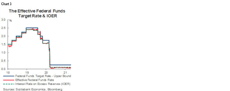 No significant policy changes are likely at this meeting. It’s extra unlikely there will be much of anything to come out of this meeting on the theory that Powell—whose job is up for renewal next February—won’t want to rock the boat ahead of Biden’s signature speech. It’s possible we hear discussion about the tools the Federal Reserve has at its disposal to control short-term rates relative to the Interest on Excess Reserves which is the de facto policy rate. The deviations have not worsened compared to prior meetings at which FOMC officials have resisted raising the IOER rate in an attempt to raise the floor for all short-term market rates (chart 3). Further, the US$50 billion increase in the counterparty limit for overnight reverse repurchase agreement operations to US$80 billion signalled a preference toward using other tools first.
