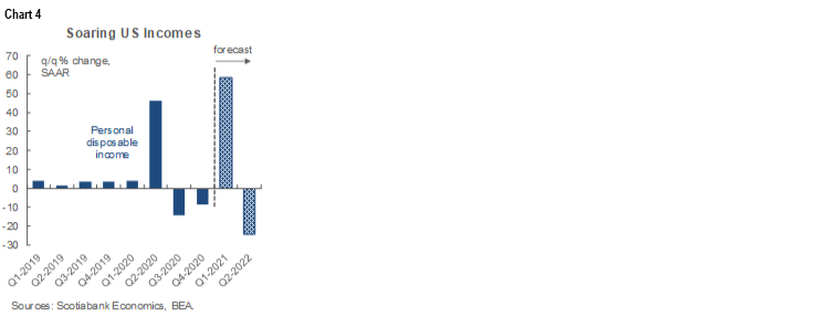Personal income growth is likely to soar to about 20% m/m because of stimulus cheques and growth in wages and salaries as almost one million jobs were recreated in March. About 80% of the American Recovery Act’s stimulus cheques were distributed in March with the bulk of the remainder still being distributed in April. Chart 4 shows updated income growth projections based on current tracking of the weekly distribution of such cheques.