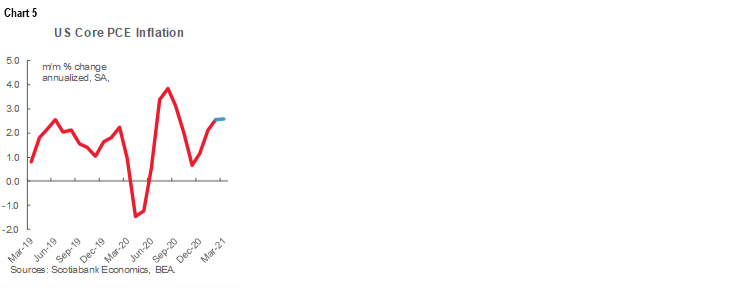 - Given we already know CPI, headline PCE inflation is expected to rise to 2.4% y/y (from 1.6% the prior month) with core PCE inflation increased to 1.8% y/y (from 1.4%). Base effects won’t explain all of that as sizeable month-ago price gains are expected for both readings. In fact, if the estimate for March core PCE inflation over February is correct, then the trend in the annualized monthly price pressures is much firmer than the Fed has generally been letting on and it isn’t clear that’s just transitory (chart 5).