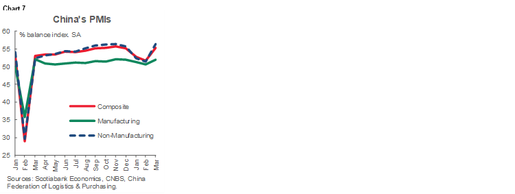 China’s state PMI readings for April (Thursday night) may be cleaner indicators than the ones we’ve been dealing with so far this year that have been distorted by the tighter restrictions around Lunar New Year holiday effects during January and February that drove a rebound in March when the holiday effects ease (chart 7).