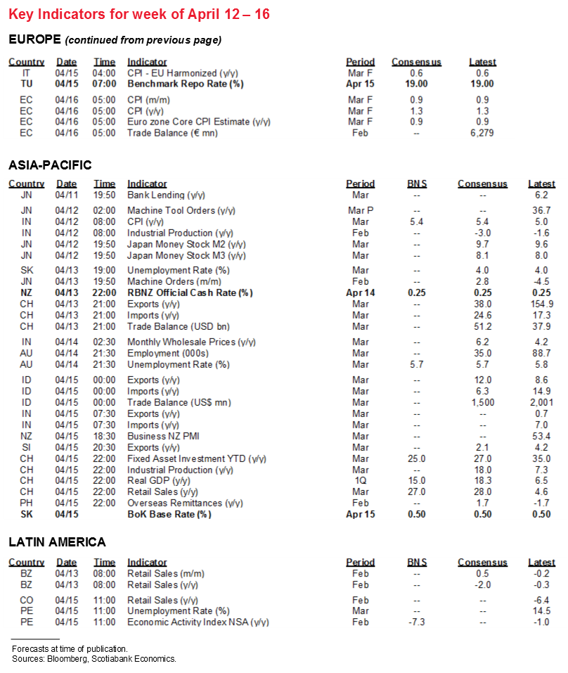 This report has been prepared by Scotiabank Economics as a resource for the clients of Scotiabank. Opinions, estimates and projections contained herein are our own as of the date hereof and are subject to change without notice. The information and opinions contained herein have been compiled or arrived at from sources believed reliable but no representation or warranty, express or implied, is made as to their accuracy or completeness. Neither Scotiabank nor any of its officers, directors, partners, employees or affiliates accepts any liability whatsoever for any direct or consequential loss arising from any use of this report or its contents.