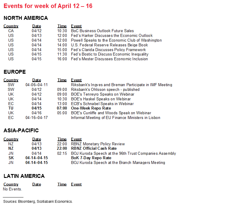 Central banks are unlikely to figure prominently until the week after next when we’ll have a keen eye on Bank of Canada decisions. In the meantime, Fed Chair Powell will make two appearances, one on Sunday night on the tv program ’60 minutes’ which will probably be similar in nature to his past appearance on that show during which he spoke to a general audience. He speaks again on Wednesday in a virtual interview with the Economic Club of Washington (12pmET). Vice Chair Clarida also speaks a little later on Wednesday about the Fed’s new framework.