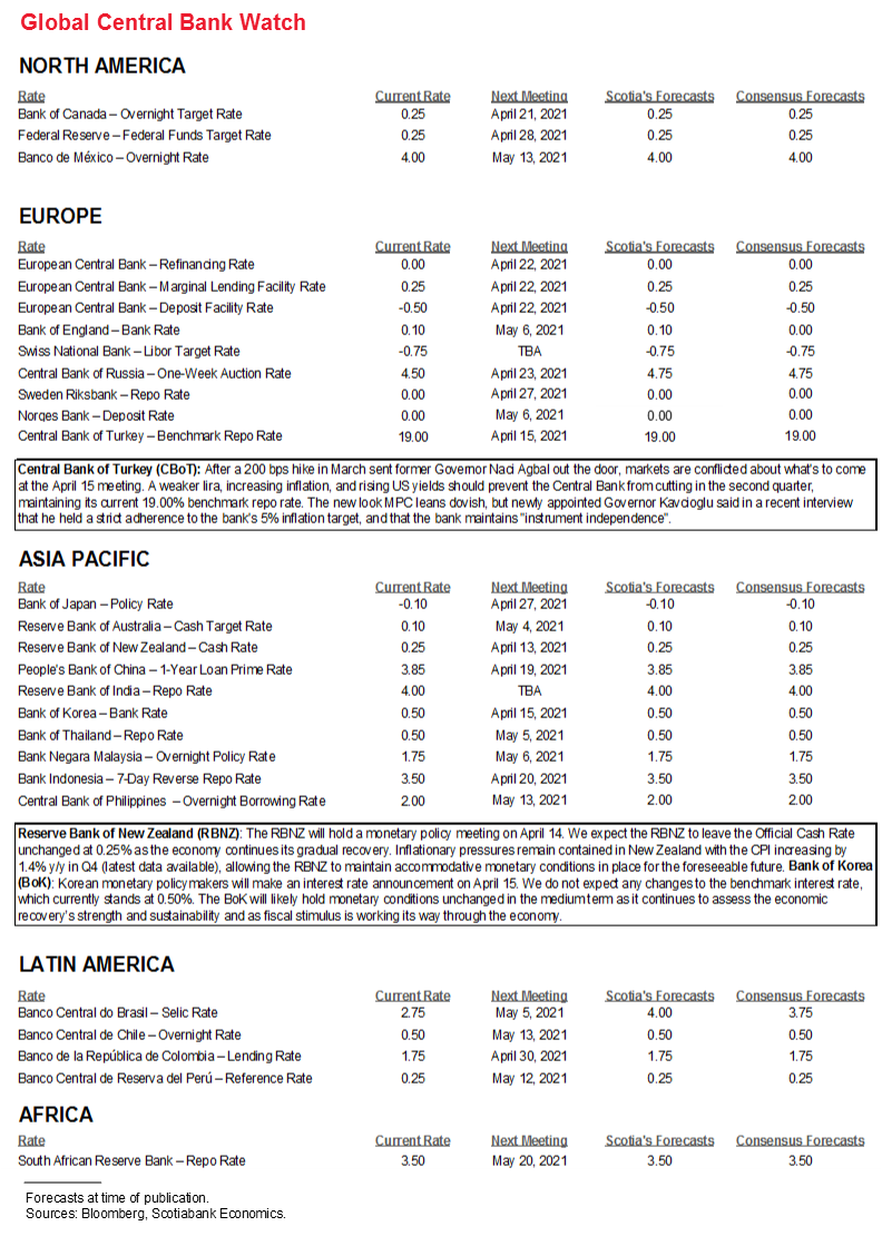 Statistics Canada will update CPI from November through February on Monday in order to account for changed consumer spending basket weights during the pandemic. The results are likely to marginally raise estimated inflation compared to official estimates before StatsCan permanently adopts the revised basket weights starting with the June CPI release. We’re unlikely to get a feel for the consequences to core inflation until the June release. Canada should see weakness in February manufacturing sales (Thursday) based upon StatsCan’s guidance for a 1% drop. Friday’s wholesale trade figures for the same month were guided to be down by 0.4% m/m.