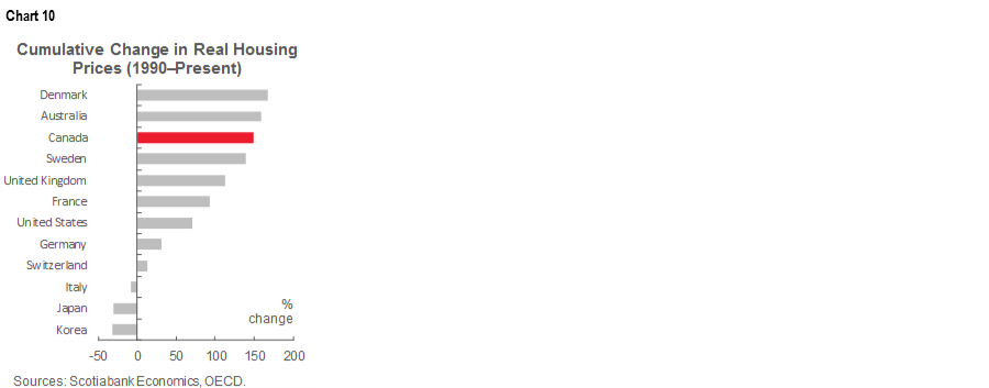 As argued here, however, it’s not just a rate argument behind housing strength—although promising indebted Canadian households that rates wouldn’t go up for years probably played a substantial role in a policy over reach by the BoC. Strong job growth, stockpiled savings and less spending on pandemic-stricken activities could well be behind strength in demand for mortgages and homes. In a longer run sense, it might even be that one of the reasons why Canada has had among the strongest cumulative house price gains over a long period of time (chart 10) owes itself to a better managed system that didn’t blow up during the Global Financial Crisis and is premised upon a sounder housing finance framework.