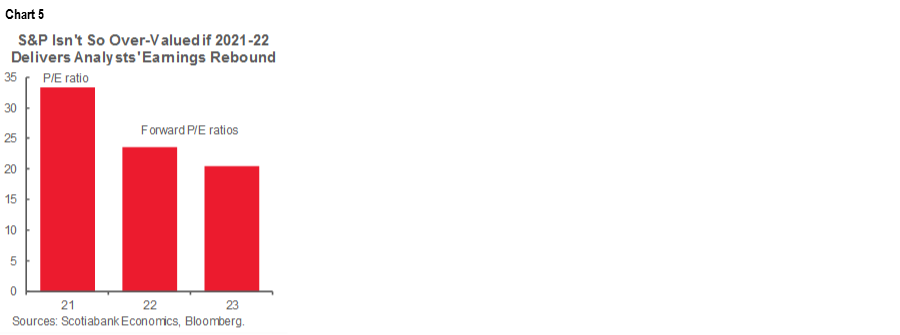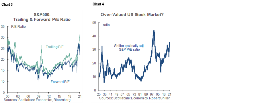 Enter the question of what’s priced and whether equities are overly rich. Judged by a conventional 12-month trailing price-to-earnings ratio, equities are looking rather rich indeed with the S&P at 33.5 times earnings (chart 3). Using Shiller’s Cyclically-Adjusted Price-to-Earnings ratio (CAPE) that compares prices to a rolling ten year earnings cycle also looks rather rich (chart 4). Obviously, the denominators in both of these ratios are distorted by the depths of the pandemic which is no longer relevant to markets that began pricing a more upbeat outlook almost instantaneously a year ago. They are also distorted by the prolonged post-GFC recovery.
