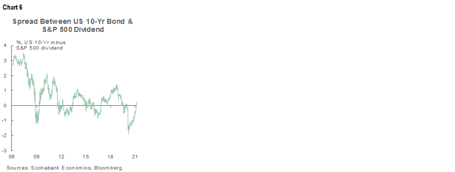 Dividend yield is another way of looking at valuations. The yield on the S&P500 sits at 1.4% which inverts the prior relationship to the US 10-year Treasury yield that now sits materially above 1.4% (chart 6). There are a lot of adjustments one would have to make to this casual relationship, but one of the more important ones would involve marrying the spot figure to expectations for payouts on expected future earnings. The analyst consensus expects dividend yields to rise going forward, but probably not as fast as we forecast the 10-year Treasury yield to increase. That means valuation measures should tilt toward capital gains expectations more so than income.