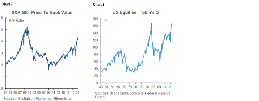 Other valuation measures also appear rich, though they tend to rely upon price measures expressed relative to historical accumulated book values (chart 7) and attempts at estimating the replacement value of assets (chart 8) rather than future earnings and book values.