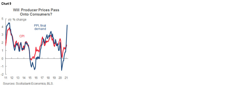 The toughest wildcard of all is the extent to which supply chain pressures on producer prices are being passed through to consumers in seasonally abnormal ways given all the bottlenecks this year. Final demand producer prices accelerated at the fastest pace since late 2011 last month (+4.2% y/y, +1% m/m) and this measure is very highly correlated with headline CPI inflation (chart 9) although CPI is somewhat less volatile at rapid turning points. This is where upside risk to 2.5% y/y could arise.