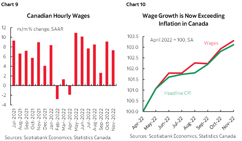 Key will remain wage growth in a very tight labour market. Taking average hourly wages of permanent workers from the Labour Force Survey and seasonally adjusting them reveals a sharp acceleration of wage growth shown in chart 9. Wage gains well into the upper single digit percentage points are being registered since the summer of 2021 with a brief interruption at the start of 2022. Wage gains have been slightly exceeding inflation since May of this year (chart 10). That’s not enough to give anyone the impression that they’ve won the lottery, but it’s incremental progress that we expect to build upon itself into 2023 as inflation remains challenging but down from the stratosphere while wage gains continue.