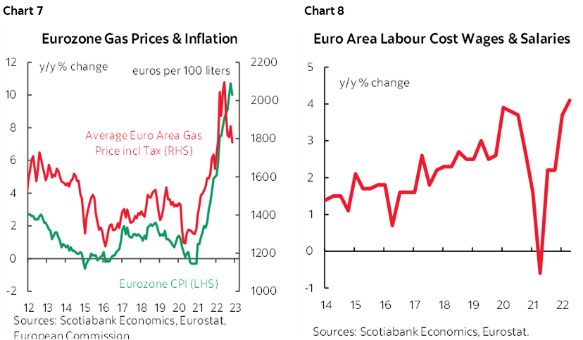 More of the focus will be upon core inflation that is running at 5% y/y for a record-high since the euro was launched on January 1st 1999. Passthrough pressures from high energy and food prices may persist alongside wage growth supports (chart 8), but the euro’s appreciation since October may work in the other direction if it persists.