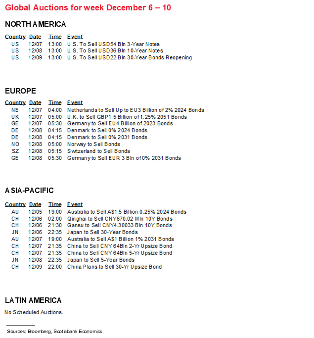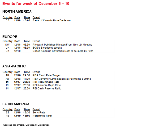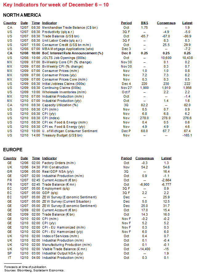 We don’t expect to hear word on the BoC’s strategic review this week. Governor Macklem delivers the customary pre-holiday speech the week afterward.