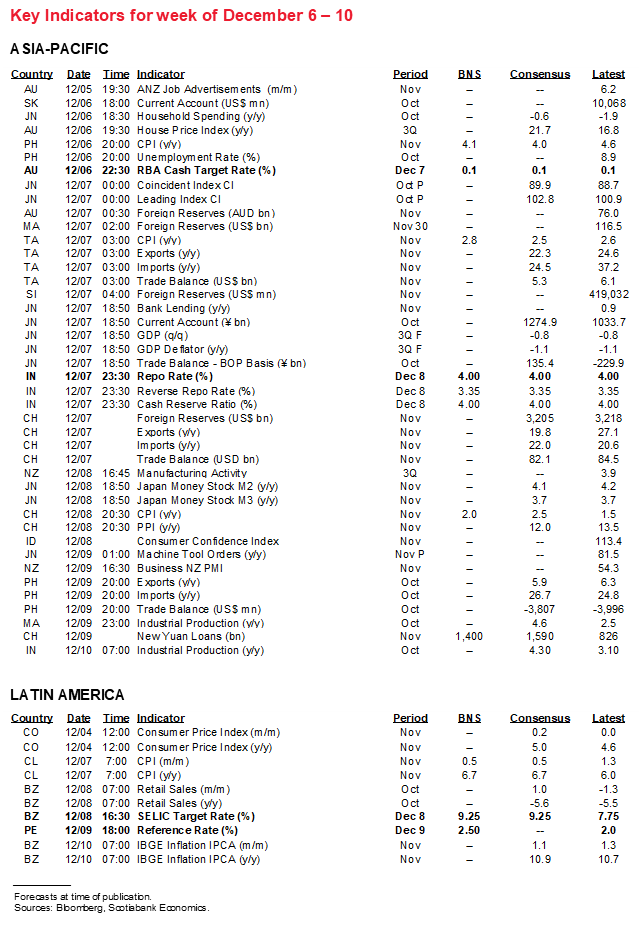 While their central banks won’t be making policy decisions over the coming week, local monetary policy considerations may be further informed by a wave of CPI inflation updates for November starting with Colombia on Saturday, followed by Philippines on Monday, then Chile and Taiwan on Tuesday, Mexico on Thursday and Norway on Friday. I’ll write about those during the week as they arise.