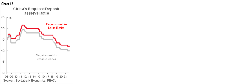 Chinese Premier Li recently stated that a cut to the required reserve ratio applied to banks may be delivered “at proper time.” Any day now would be welcome given mounting downside risks. Chart 12 shows the evolution of required reserve ratios. If cut, it could free up somewhat more bank capital to apply to lending which could help to stimulate China’s sagging economic growth. Events over the course of this week might offer a suitable backdrop for such a move including CPI on Thursday and the aggregate financing figures for the overall economy that are due at some point this week or next.