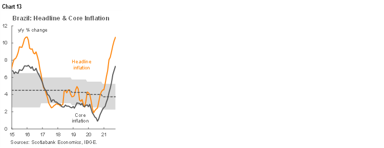 Brazil’s central bank is expected to hike its policy Selic rate by another 150bps to 9.25% on Wednesday. Why? Because at the last meeting on October 27th they hiked by 150bps and rather explicitly said “For the next meeting, the Committee foresees another adjustment of the same magnitude.” Since then, Brazilian inflation spiked higher again on November 10th when it hit 10.7% y/y (from 10.25%). Another update is coming next Friday (chart 13).