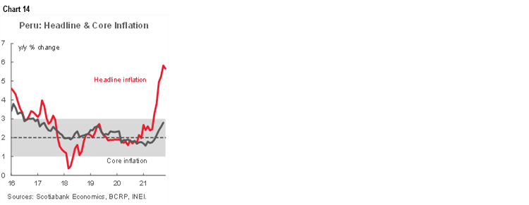 Peru’s central bank is expected to hike by 50bps to a new policy rate of 2.5% on Thursday. Inflation ebbed a bit in November but remains at 5.7% y/y while core inflation accelerated to 2.9% y/y (chart 14).