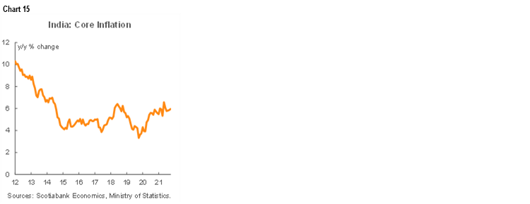 The Reserve Bank of India’s policy decision on Tuesday evening (ET) is not expected to reveal major shifts in policy guidance. Discussion around forward guidance for policy tightening in 2022 may be a risk in light of rising core inflation (chart 15).