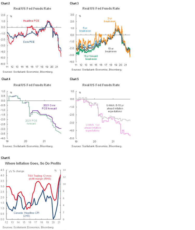 Firstly, hawkish?? I think it’s the opposite and a pivot toward opening the door to hiking the nominal policy rate is needed in order to take some of that back. The Federal Reserve allowed the real policy rate to turn more deeply negative and hence easier as any measure of backward- or forward-looking inflation expectations has risen while they talked through it (charts 2-5). That would be true even if inflation cruises back down from 6–7%+ to materially lower. Macro models use real rates. When real rates go more deeply negative and the Fed’s reaction function to the development is at best described as a policy of benign neglect or at worst outright policy error (I think the latter…), then they invoke more stimulus to the economy precisely when we don’t need it. More stimulus—all else equal—means more inflation. Think of a simple example being a company that is getting more net pricing power in excess of what has happened to their borrowing costs which buoys margins which can benefit the real economy. Chart 6 shows the connection between inflation and profit margins as evidence.