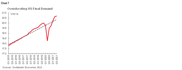 As for what’s causing inflation, some of it is obviously supply driven, but central banks are trying to let themselves off the hook by exaggerating its prominence and some folks in the markets are rather complicit in this regard! For one thing, chart 7 shows the surge in domestic demand as policy over-stimulated demand. Fitting a pre-pandemic trend-line to final demand shows that if the goal was to right the ship in terms of final demand then mission accomplished and perhaps then some! The rate sensitivity of demand may have been a lot greater than central banks assumed it would be.
