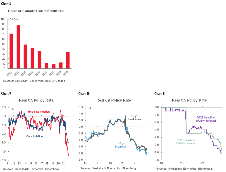 To date, the BoC has only said they will reinvest “at least until we raise the policy interest rate” and they have not provided guidance on asset sales. There are no GoC bonds maturing off the BoC’s balance sheet either over the remainder of this month or in January before a wave of maturities subsequently arrive (chart 8). This could therefore be a window of opportunity for refreshed guidance especially in light of the fact that jobs have increased by another 185k since the October meeting while arguably pushing into maximum employment (recap here). Furthermore, through the monetary policymaker’s version of benign neglect, the real policy rate has pushed more deeply negative and via this measure has served to ease monetary policy conditions (charts 9-11).