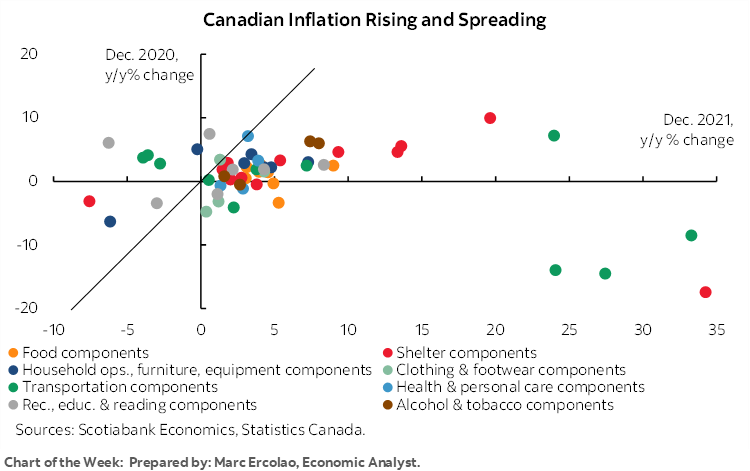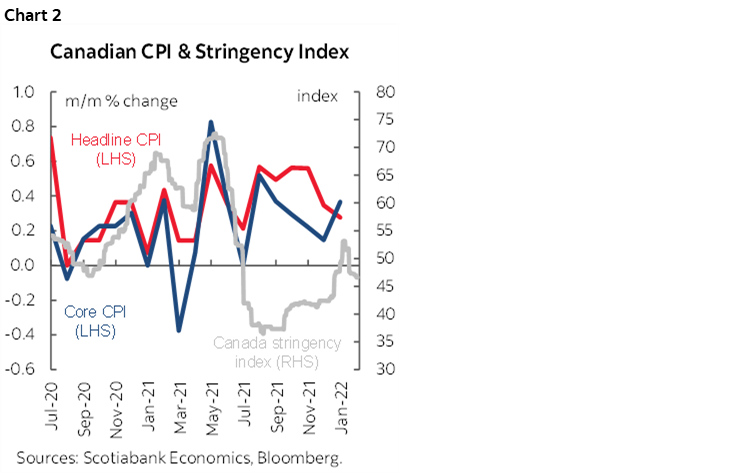 The Bank of Canada probably wouldn’t be surprised by such a move higher given that the January MPR indicated they expect inflation “to remain close to 5% over the first half of 2022.” The debate that will then ensue is the degree to which year-over-year inflation may begin to ebb and whether that’s the appropriate yardstick in any event versus month-over-month annualized inflation over the fuller cycle ahead.