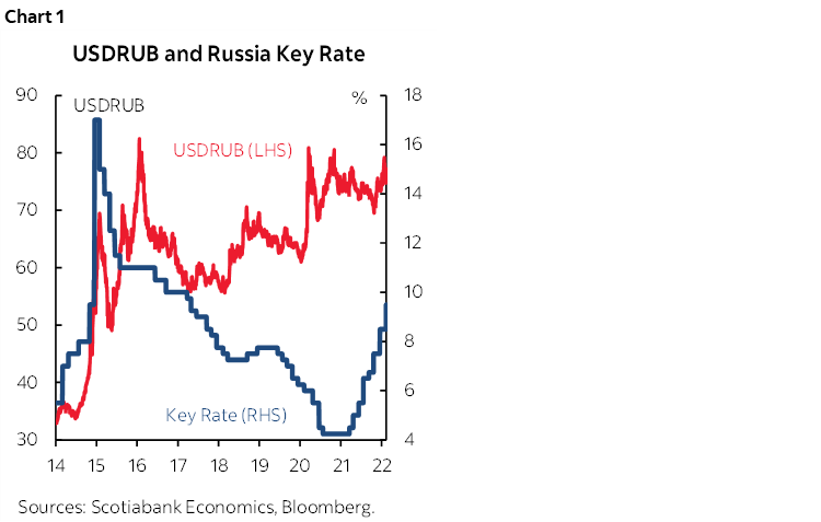 But the possible takeaway is that the potential return of this geopolitical risk could be a tactical and relatively short-lived trade that fails to knock the Federal Reserve off course while it remains wedded to achieving its dual mandate. Today’s very different circumstances including much higher inflation are likely to solidify that focus barring much worse outcomes this time. There are clear limits to this thinking that could turn out worse. I’d rather not at this point entertain risk of a fuller conflict that draws in a NATO-led confrontation! Until we have greater information, it may be better to assume a near replay of 2014 in which case Russia gets heavily sanctioned and the ruble eventually collapses and subsequently drives imported inflation much higher. That scenario in 2014–15 drove the Russian central bank to hike its key rate from 5.5% at the start of 2014 to a peak of 17% by the end of 2014 (chart 1). The Russian economy achieved no growth in 2014 and shrank by 2% in 2015.