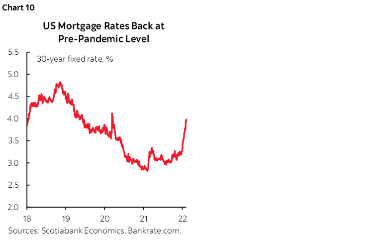 Other US developments will principally focus upon the housing and industrial complexes. Housing starts should rise in January’s estimate given strong gains in permits (Thursday). Existing home sales, however, could follow the decline in pending home sales given that they turn up as completed resales generally within 30–90 days. Economy watchers should be braced for future weakness in home sales given the speed with which mortgage rates have risen and particularly the bellwether 30-year rate that has suddenly fully normalized toward pre-pandemic levels (chart 10). Industrial output during January (Wednesday) may post mild growth but with downside risk given the weakening in the ISM-manufacturing-production subindex. The start of another round of regional manufacturing reports on the path to the next ISM-manufacturing gauge will commence on Tuesday with the Empire measure, followed by the Philly Fed’s gauge on Thursday.