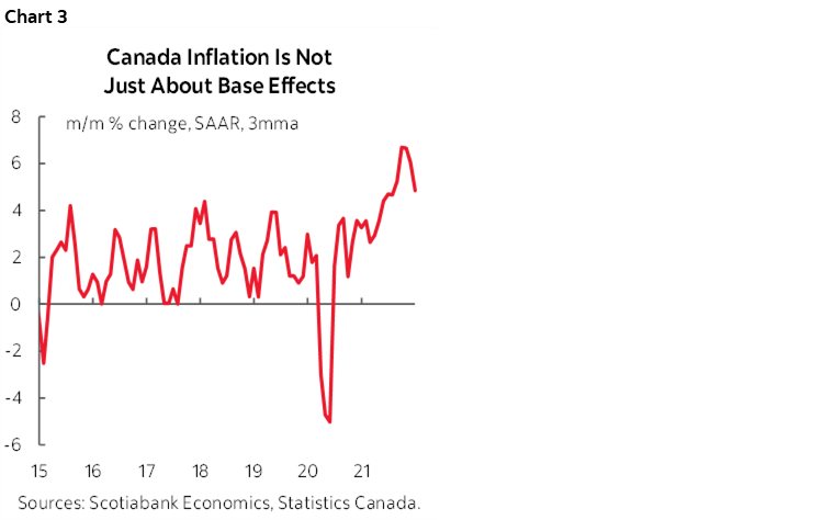 Also recall that the temptation to compare Canadian to US CPI inflation needs to control for notable methodological differences. For one thing, Canadian CPI excludes used vehicle prices. They were up by another 2.3% m/m using the Black Book measure and 44% y/y which would add 1.8 percentage points to Canadian headline CPI if we used a similar weight to how used vehicles are included in US CPI (chart 4). The exact weight that should be used in the Canadian context is uncertain and so is the exact measure of used vehicle prices but no others are available on a monthly basis. The general point is that inflation including used vehicle prices would probably be at least in the 6–7% y/y range in Canada if we captured used vehicles. Then there are the other more customary debates over the big differences between how Canada captures housing compared to US CPI.