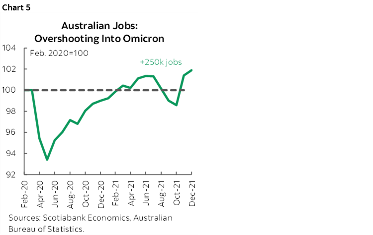 Australia updates jobs for the month of January on Wednesday. Australia’s labour market is among the leaders of the employment recovery across developed economies and is sitting about 250k jobs above its pre-pandemic peak (chart 5). Any further job gain in January would be a sign of excess labour market strength as a flat reading is expected. The hit from the omicron wave should show up more clearly as a temporary decline in hours worked. As is the case with many global economies, we may see Australia’s labour market enter a phase of temporary volatility, as virus infections peaked in mid-January.