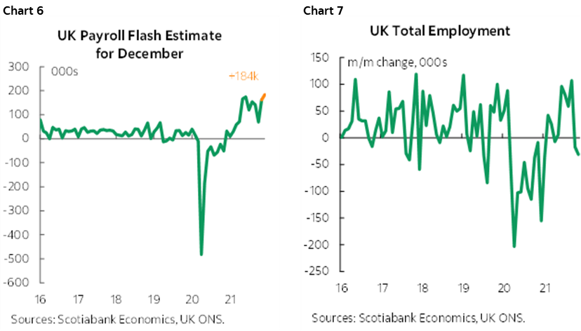 - The ILO unemployment rate for the three months ending December is expected to remain steady at 4.1%. Flash payroll data published by the ONS in advance of LFS data pointed to a reading of +184k jobs for the month of December (chart 6), subject to revision upon the January payrolls released on Tuesday. While the m/m change in total employment has slowed a touch in recent months (chart 7), the labour market is still showing signs of tightness with job vacancies remaining heightened.