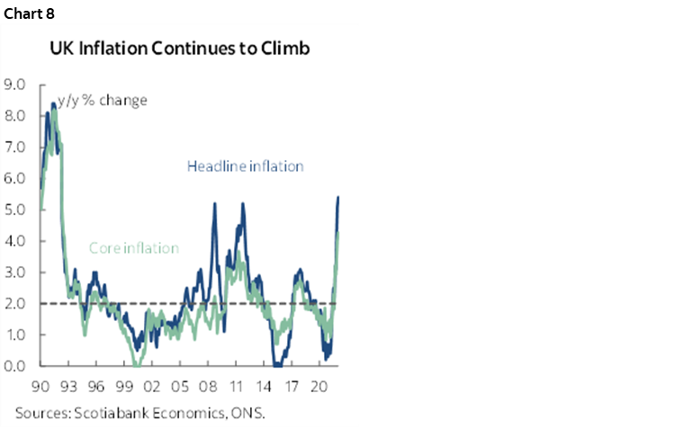 - The main indicator to watch is CPI landing on Wednesday as the UK comes off fresh 20-year highs (chart 8). December headline and core inflation came in at 5.4% and 4.3% y/y, respectively. The expectation is for January inflation to hold steady or slightly dip (5.3–5.4% y/y) before accelerating until April which should mark the peak of price pressures.