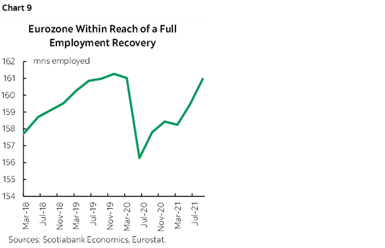 Other European releases will be pretty light. The opening round of monthly sentiment surveys that can collectively inform GDP tracking commences with the ZEW investor expectations measure for February (Tuesday) ahead of the following week’s IFO confidence and PMI readings. Q4 employment growth (Tuesday) may fully recapture jobs lost due to the pandemic with even just a modest further gain (chart 9).