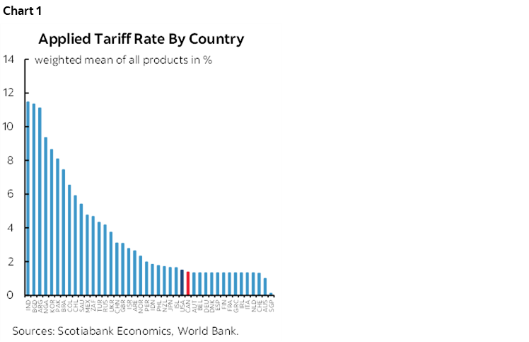 On tariff rates, there is little question that the US has among the lowest tariff rates in the world, but not as low as you might think and especially since its tariffs are rising. The World Bank estimates the average US tariff rate at 1.5% but of course this does not include proposed but delayed measures. Canada’s is right behind at 1.4%. The UK is higher at 3.1%, Eurozone countries like Germany, France, Italy and Spain are all lower at 1.3% (chart 1).