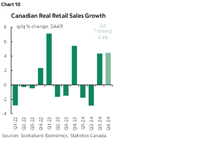 This is despite a modest amount of slack. Consumers’ inflation expectations remain at the top end of the BoC’s 1–3% inflation target range. Wage growth remains excessive relative to productivity. The consumer sector has shown a significant response to falling interest rates with growth of 3% q/q SAAR or better in two of the past three quarters pending Q4 for which we can point to strong tracking of retail sales volumes (chart 10).