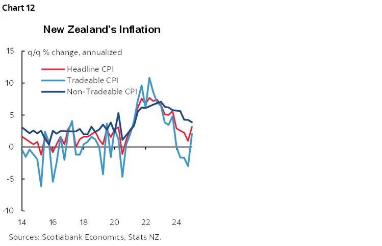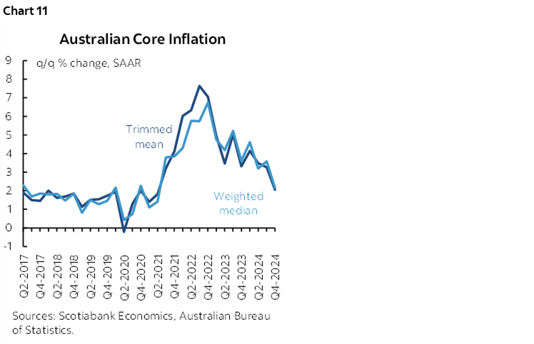 One reason is that inflation has continued to make progress toward the RBA’s 2–3% target range. Key is that trimmed mean and weighted median CPI readings both landed on 0.5% q/q SA which when annualized lands at the bottom end of the RBA’s headline target range. That suggests rapidly softening underlying price pressures at the margin (chart 11).