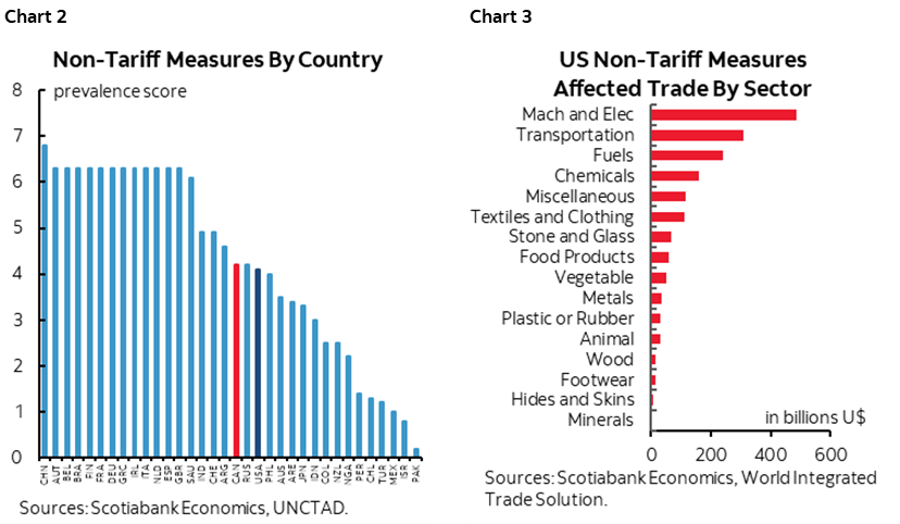 Yet tariffs give a highly incomplete sense of the degree of barriers to trade. Take for instance non-tariff measures (NTMs). The UNCTAD—the UN Trade and Development agency—ranks Canada at 4.2 on its overall prevalence score for NTMs (here). The US? It’s at 4.1. Such a difference is trivial. Other sites like this one for Canada and this one for the US from the World Bank offer similar conclusions. Chart 2 shows the global ranking of NTMs by country. The US applies NTMs on $1¾ trillion of imports and chart 3 shows the sectors where they are most prevalent.